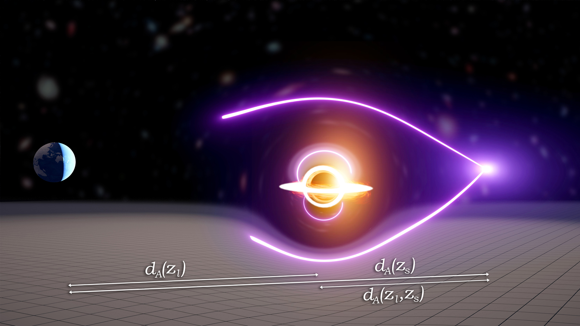 The chance alignment of a lens with a distant source results in a phenomenon known as gravitational lensing. Light from the source travels around the lens object, in our case an intermediate mass black hole, and is deflected by its gravitational field back towards the observer. In the simplest case, two paths are created which reach the telescope. Two paths equates to two images, and having travelled different distances, they spend different amounts of time reaching Earth. Despite travelling many billions of light-years to reach us, this difference in arrival time is just 400ms in our case. The path which traverses deeper into the potential well — closer to the black hole — experiences a stronger time dilation, and thus arrives later than the other image. The time delay, in addition to the ratio of the brightness of the two images (the magnification ratio), gives us an estimate for the mass of the lens. The most likely time delay roughly scales as 50 seconds per million solar masses.